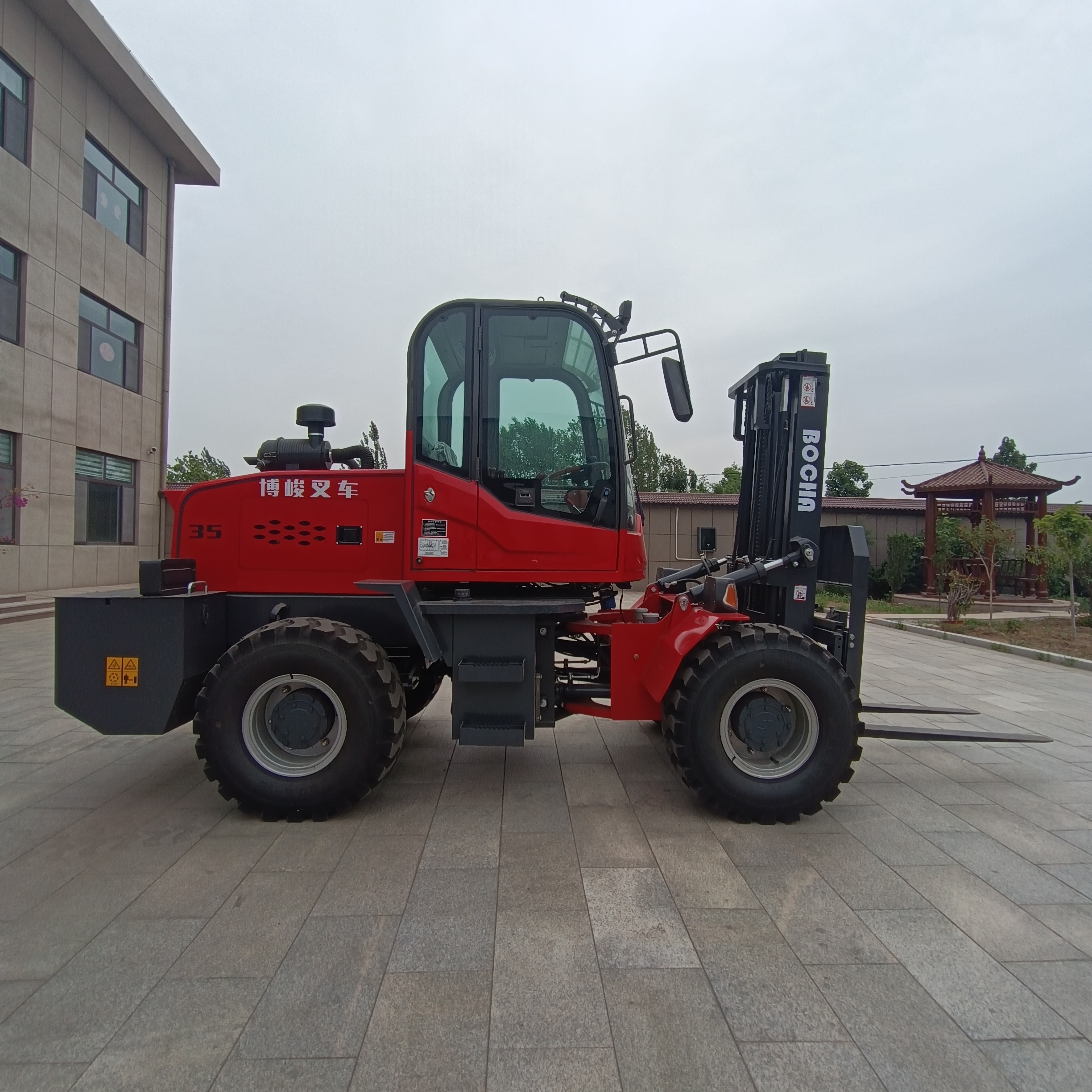 博峻叉車可以讓你不再為此糾結犯難 ,咱廠生產的鉸接式4驅越野叉車經過專業的設計成功的把車身的尺寸縮短成3.6米,龍門架做成三階4米的,靜止高度只有1.97米,而且三節門架還不影響在地下室內舉升物品,選擇博俊越野叉車它適合于全地型工作。
